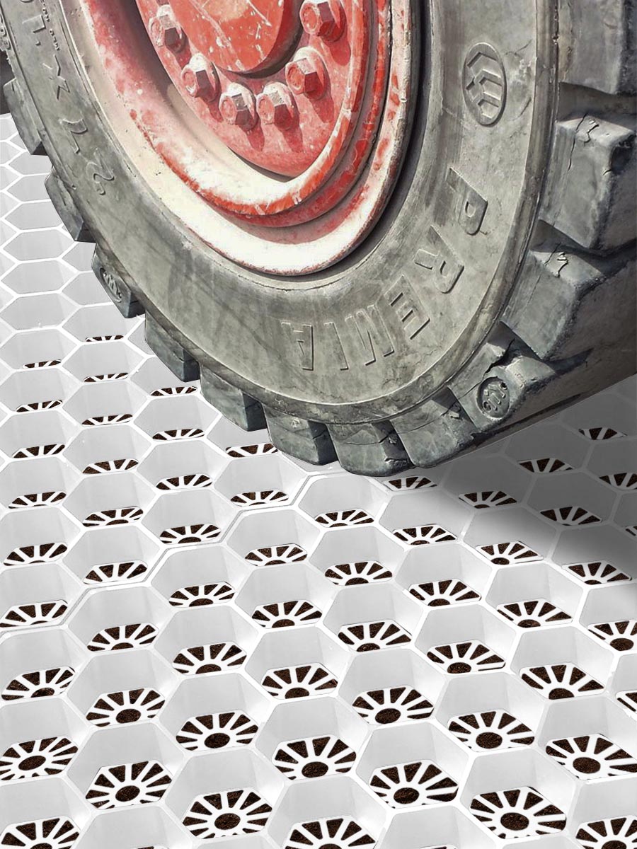 Grote, zeer drukvaste witte splitplaten / grindroosters van het merk Easygravel, met handig kliksysteem, zonder anti-worteldoek. Voorkomt de vorming van kuilen en spoorvorming in grind of siersplit.