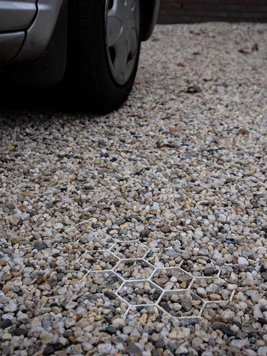 - De grote diameter van de cellen maken de grindmat ook geschikt voor wat grotere grind- en splitformaten (voor grind en split max. 25mm zeefmaat te gebruiken)