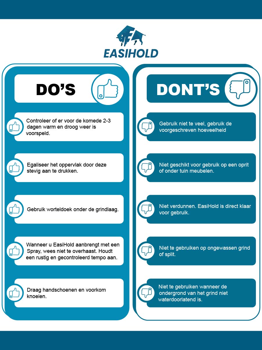 Easihold is een bindmiddel, speciaal ontworpen voor bodemproducten. Het product is op waterbasis en bevat geen giftige stoffen. Na het aanbrengen van de vloeistof zal het water verdampen, waarna de Easihold in de vloeistof zijn werk kan doen. Naast het op de plaats houden van stenen, omhult het ook de steentjes met een beschermlaag. Deze beschermlaag heeft twee voordelen. Ten eerste geeft het een mooie glanslaag op uw steentjes. Ten tweede zorgt Easihold er ook voor dat vlekken in de loop van de tijd uitblijven.