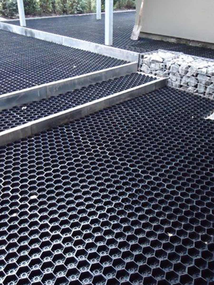 Grote, zeer drukvaste zwarte splitplaten / grindroosters van het merk Easygravel, met handig kliksysteem, zonder anti-worteldoek. Voorkomt de vorming van kuilen en spoorvorming in grind of siersplit.