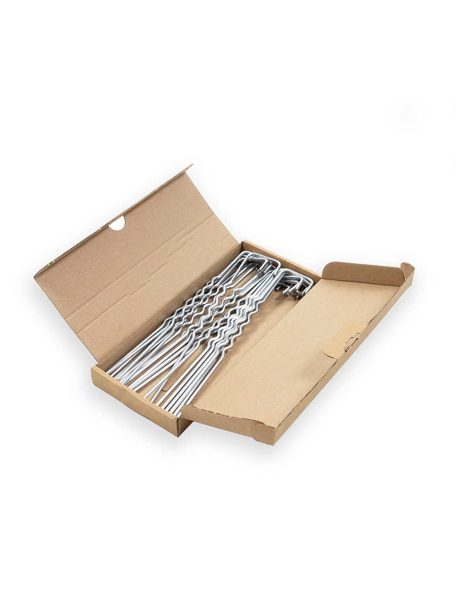 De Zigzag grondpennen zijn gemaakt van verzinkt (gegalvaniseerd) staal. Afmetingen: 25,5cm lengte x 4,5cm (bovenzijde) x 4mm dikte.